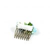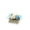Peineta de rosas de papel en tonos azul y blanco, adornada con pequeños pistilos blancos. Las púas son metálicas, color oro viejo.